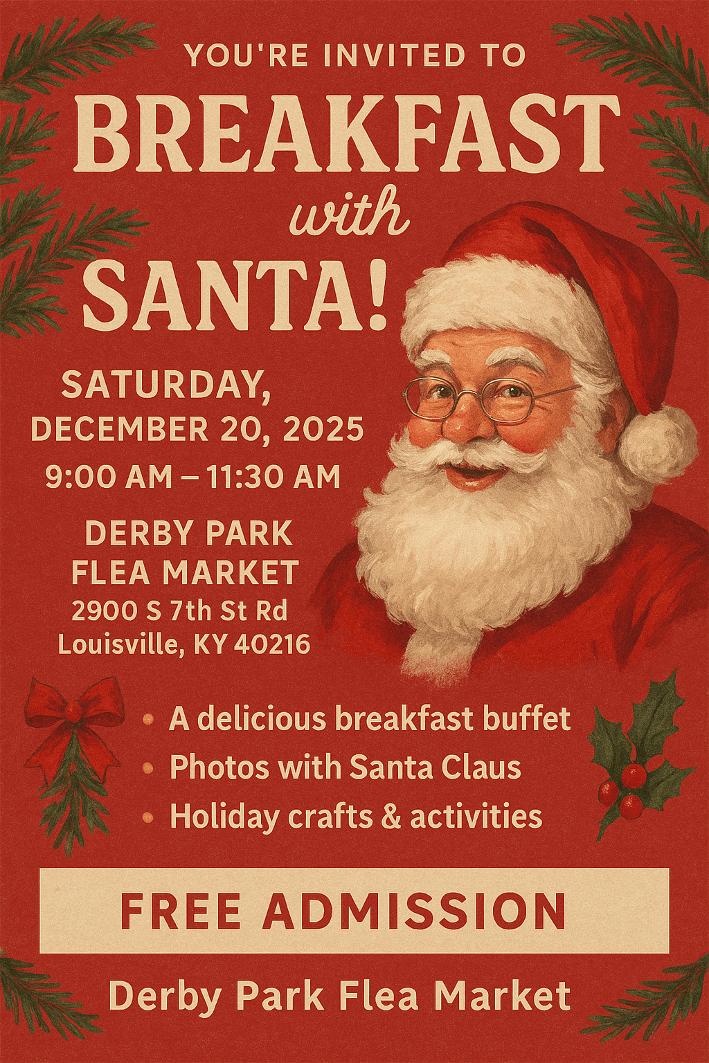 If you like to create an event, click here « All Events This event has passed. Event Series: Winter Wonderland Breakfast with Santa December 20, 2025 @ 9:00 am - 11:30 am « Cookies and Cocoa with Santa Pictures with Bunny » Add to calendar Google Calendar iCalendar Outlook 365 Outlook Live Details Date: December 20, 2025 Time: 9:00 am - 11:30 am Series: Winter Wonderland Organizer DERBY PARK FLEA MARKET Venue Derby Park Fleam Market 2900 7th Street Road Louisville, KY 40216 United States + Google Map